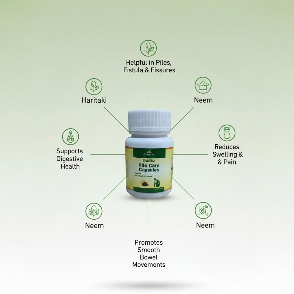 Sawrna Piles Care Capsules are a 100% natural Ayurvedic formulation made from time-tested herbs sourced from the pristine regions of Himachal Pradesh. Specially designed to support smooth bowel movements and reduce discomfort, these capsules help relieve pain, swelling, and irritation associated with piles and fissures, promoting long-term digestive and bowel health.